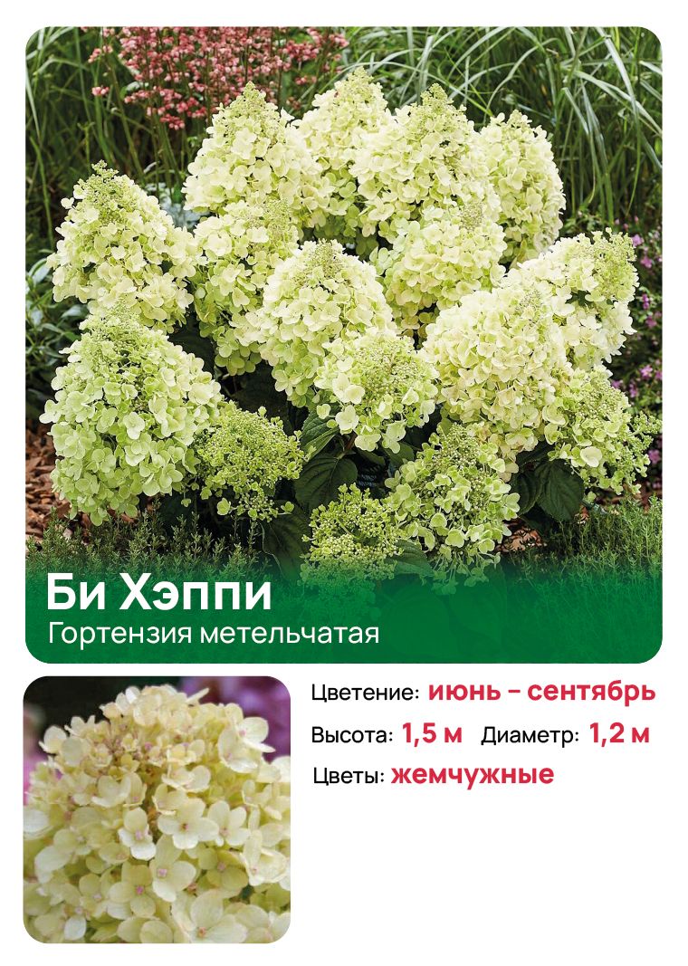 Метельчатая гортензия Би Хэппи (Bee Happy) является компактным сортом с воздушными нежными соцветиями жемчужного окраса, достигающий 1.5 м в высоту и 1.2 м в ширину. Годовой прирост объема – 30 см. Она довольно популярна среди садоводов, так как ее можно выращивать во многих регионах России благодаря зимостойкости и неприхотливости. Цветение с июня и до сентября. Побеги мощные и прочные, прямостоячие, на них расположены зеленые листья яйцевидной формы с блестящей поверхностью. Соцветия крупные, конические, жемчужно-белые, с хорошей плотностью, собраны из крупных цветков. Они источают нежнейший аромат и не меняют окраса во время вегетации. Би Хэппи отличается крупными цветками кремово–белого оттенка. Они собраны в плотные конические соцветия, 20 см.