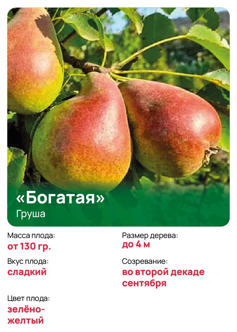 Дерево среднерослое (4 м), отличается сильным ростом в молодом возрасте. Крона редкая, округлая. Плоды средние (масса 130 г), одномерные, правильной грушевидной формы. Кожица нежная, гладкая, маслянистая. Окраска в момент съема зеленая, при созревании зеленовато-желтая с красивым размытым малиновым румянцем. Мякоть очень сочная, хорошего вкуса. Съемная зрелость в конце второй декады сентября. В зависимости от погодных условий плоды могут храниться в течение одного-трех месяцев. Скороплодность средняя. Урожайность высокая и ежегодная. Сорт высокозимостойкий. Отличается высокой устойчивостью к парше и грушевому галловому клещу.